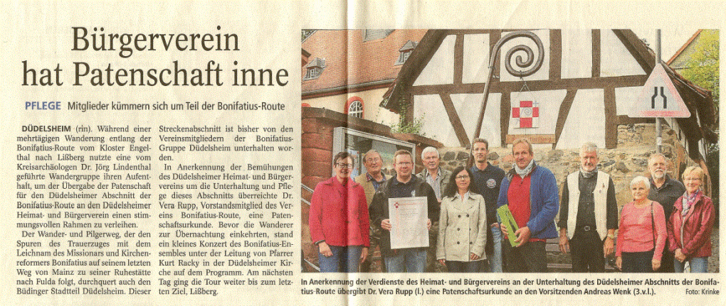 Seit dem Jahr 2015 kümmern sich nunmehr Mitglieder des Heimat- und Bürgerverein um die Pflege der Bonifatiusroute. Hierzu werden regelmäßig die Wege und Pfade am Streckenabschnitt Düdelsheim gemäht, kontrolliert und bei Bedarf Reparaturen durchgeführt.