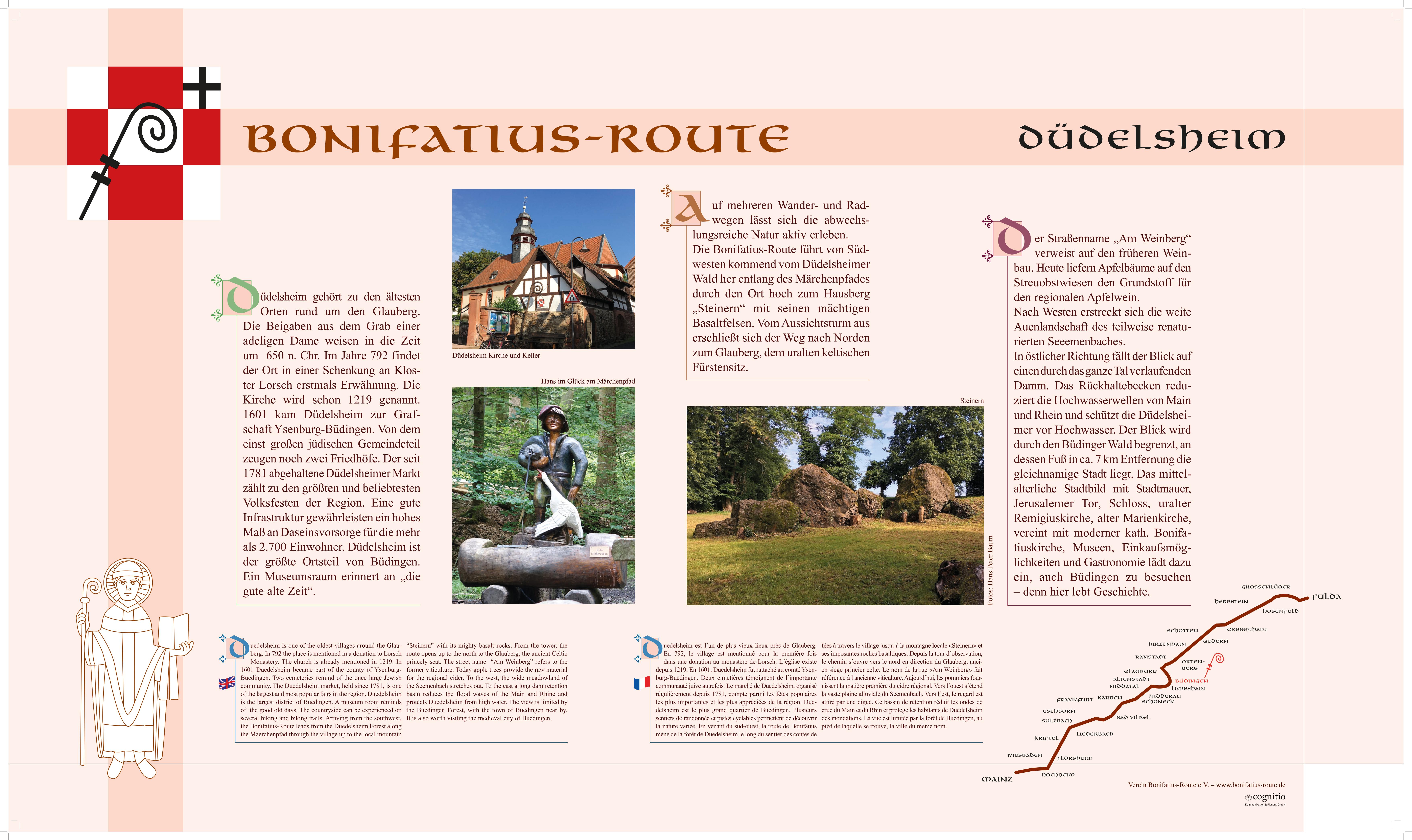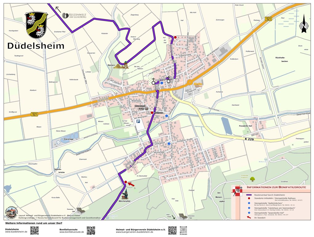 Der Streckenabschnitt der durch Düdelsheim laufenden Route wurde im Jahr 2004 maßgeblich durch die Bonifatius-Gruppe Düdelsheim ausgearbeitet und mit viel Engagement gestaltet. So sind beispielsweise verschiedene Markierungssteine, Pfeile und Übersichtskarten an der Strecke angebracht, um die Wanderer und Pilger zu führen. Am Kirchplatz wurde an zentraler Stelle ein Bonifatiusstab montiert. Für diese Arbeiten und Ideen gebührt der Bonifatius-Gruppe Düdelsheim hohe Anerkennung.